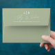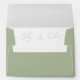 Elegant script calligraphy sage green wedding envelope. Present your wedding invitations in style with these sage green envelopes featuring whimsical script calligraphy. The envelopes showcase a sophisticated sage green colour, setting a tone of understated elegance. The envelope flap provides an excellent opportunity for personalization, allowing you to feature your initials and names in graceful script typography, beautifully complemented by your return address in a crisp, white print. The inside of the envelope also features the names of the couple. These are not merely envelopes; they are the first glimpse your guests will have into the beauty and refinement of your wedding day.