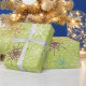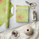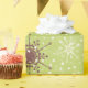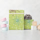 Pretty holiday or winter wrapping paper features a whimsical snowflake design features snowflakes of cream, red, brown, and blue on a green background.
