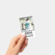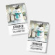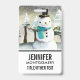 Name badge with a cute drawing featuring a snowman wearing a cool top hat and scarf. The background has a line of whimsical snow-covered pine trees.