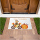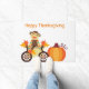 Whimsical bike riding sock monkey with big orange pumpkin and customizable Thanksgiving text on white background