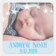 Personalized new baby boy blue background, baby photo, name and birth date stickers.