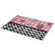 Whimsical Spring / Summer themed cutting board design features top half of red and pink strawberries on pink gingham and bottom half of black and white chequerboard.