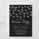 Elegant and whimsical welcome party invitation featuring white hanging fairy lights on black background. This invitation is perfect for nautical-themed and outdoor events.