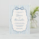 This dusty blue and ivory whimsical coastal wedding invitation features a hand drawn scalloped frame with a bow on a background of watercolor stripes, and handwriting script.