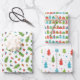 Red, green and blue Christmas wrapping paper set with three patterns of Christmas trees and wrapped gifts, all in a whimsical retro style. Wrap your gifts this Christmas with a matching set of three wrapping paper sheets with whimsical Christmas patterns in red, green, and blue against a white background.