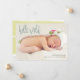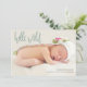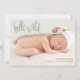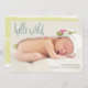 Whimsical script "hello world" for beautiful photo birth announcement with custom elegant font personalization in the lower right corner. Choose between different pastel versions or monochrome for your special announcement card.