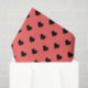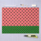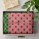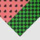 Whimsical tissue paper sheet features watermelon pink and black hearts pattern with dark green chequerboard bottom border.