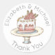 Whimsical illustration of a slice of wedding cake with two text fields features on this quality sticker set, ideal for wedding favours or packaging.