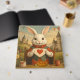 Fall in love with this charming and unique take on the White Rabbit from Alice in Wonderland! This delightful illustration portrays a cute, anthropomorphic white rabbit seated at a rustic table, holding a heart-adorned invitation or card. Dressed in a whimsical red and green outfit, he's ready for a tea party in an enchanting landscape dotted with fairytale castles, colourful banners, and blooming flowers. Teacups and a cake complete this sweet and imaginative scene, perfect for fans of Alice in Wonderland and anyone who adores whimsical, heart-filled art.