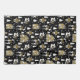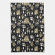 Whimsical holiday design features white and gold coloured illustrations of winter dressed animals (squirrel, reindeer and polar bear), trees and buildings on black background.