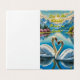 The card features a breathtaking scene of two elegant swans forming a heart shape with their necks on a serene, calm lake. They gracefully glide through the water, surrounded by delicate, floating flowers that gently kiss the surface. In the background, majestic mountains rise against a sky painted in warm hues of golden sunset, hinting at a magical dusk. Autumn-coloured trees frame the scene, while soft, glistening snow blankets the landscape, evoking a warm yet wintery sensation. The enchanting atmosphere invites you to embrace the warmth of love and peace during the festive season.*