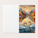 The card features a breathtaking scene of two elegant swans forming a heart shape with their necks on a serene, calm lake. They gracefully glide through the water, surrounded by delicate, floating flowers that gently kiss the surface. In the background, majestic mountains rise against a sky painted in warm hues of golden sunset, hinting at a magical dusk. Autumn-coloured trees frame the scene, while soft, glistening snow blankets the landscape, evoking a warm yet wintery sensation. The enchanting atmosphere invites you to embrace the warmth of love and peace during the festive season.