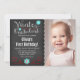 A cute winter themed 1st birthday party invitation for a little girl. Featuring aqua teal blue snowflakes and red swirls on a chalkboard background. Easily personalize with your child's photo and party information.