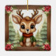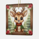 Whimsical Xmas Reindeer Holiday Decoration, rustic square ceramic ornament featuring a brown wooden frame, with Christmas poinsettia flowers and a cute baby forest animal, unique deer with antlers in a cartoon graphic art style wearing a jacket and scarf, standing in the foreground. Wintry trees, complete the winter season charm of this woodland wildlife doe character illustration, making for a great gift. Fawn lover design is on front and back. So no matter how the hanging decor turns, it always looks festive and complete. Get yours today!