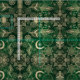 Trendy, magical gold dreamcatcher mandala floral pattern, featuring a collection of tribal feathers, mandala flowers, geometric flowers, the moon, the sun and the stars, circles, dots, squares, triangles, chevron zigzag, geometric shapes, a mandala with a protection eye, made with yellow gold and silver dots shining glitter sparkles mystical image, over a forest green, emerald, green gradient starry glow background. This trendy, mystic, tribal, fashionable, bohemian girly design, is perfect for everyday wear, home decor, celebrations and special days theme decorations.