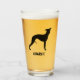 Enjoy a pint of your favourite cold beverage out of this unique 16 oz drinking glass. Whippet silhouette with custom text for your name or slogan. Makes a fun personalized gift. Visit Jenn's Doodle World for more custom drinkware and dog breed gifts.