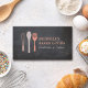 A trio of common kitchen utensils along with your name or company name makes the perfect logo on this customizable business card for a catering company, bakery, restaurant or any food-based business. Set on a black chalkboard background for a kitchen-y feel. © 1201AM CREATIVE