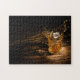 Jigsaw puzzle of an ice cube splashing into a crystal whiskey glass on a rustic wood table. Choose from the different sizes available.