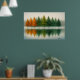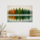 A tranquil forest scene unfolds in gradient harmony—fiery orange trees on the left surrender to soft yellow-greens, then deepen into solemn evergreens on the right. Their mirrored reflections ripple gently across a still lake, doubling the emotional weight of the composition. Snow drifts quietly through a misted backdrop, softening the edges of time and space. This piece captures the hush between autumn’s last breath and winter’s first whisper—a moment of transition, memory, and quiet anticipation.