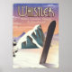 Whistler British Columbia snowboarding vintage style travel poster of a snowboard pressing into the snowy cold and freezing landscape during a sunset over a snow capped mountain.
