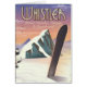 Whistler Colombie-Britannique snowboard affiche de voyage de style vintage d'un snowboard pressant dans le paysage froid enneigé et glacé pendant un coucher de soleil sur une montagne enneigée.