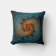 Square throw pillow design from "Whistling In The Dark," an Apophysis fractal by Susan Wallace. Copyright © 2008, Susan Wallace. Razor edged spiral of vivid orange on a textured turquoise blue background.