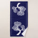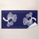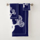White abstract circle tree, border and name on navy blue bath towels set. This lovely, design displays a white abstract tree with circles instead of leaves on all three pieces on blue background and a frame with name on the wash cloth. There is a white border around the trees. You can remove the name if desired.