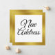 'New Address' appears in black script on the front of this moving announcement. On back you can personalize your card with your change of address with your name, new address, e-mail address and/or cell phone numbers. All text can be edited or deleted.