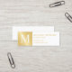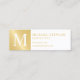 A white and gold modern elegant stylish design featuring information in gold professional serif font style on white background with white monogram on gold side border.