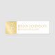 This name tag features monogram in white script font style on gold rectangle element with name and title in gold professional serif font style on white background.