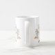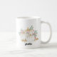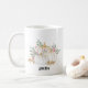 A mug with fancy watercolor white pumpkins with accents of faux gold glitter. Surrounded by green leaves and pink wild flowers.
