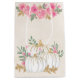 A gift bag with fancy watercolor white pumpkins with accents of faux gold glitter. Surrounded by green leaves and pink wild flowers.