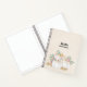 A personalized spiral notebook with fancy watercolor white pumpkins with accents of faux gold glitter. Surrounded by green leaves and pink wild flowers.