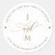 Elegant white and gold wedding sticker, great for envelope seal of favour label. Ability to add any message you like on top and bottom outer rim, great for couple's names and address for envelope seal, or for thank you message and date for favours. Centre with couple's initials with "and" in graceful modern hand written calligraphy. Note: typography is not in real foil, but rather print in a golden hue. Part of our "Elegant Calligraphy Minimalist Wedding" collection.