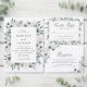 Elegant, floral place card design featuring a bouquet of white anemones, ivory roses, and dark sage green leaves at the corners. The design provides space to write your guest's name and table number. The botanical place cards reverse to feature your initials and wedding date encircled by a matching floral wreath. The inside of the place card displays a dark green watercolor design. Designed to coordinate with our White Anemones and Roses wedding collection.