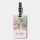 A luggage tag with a photograph featuring an apple tree branch displaying its beautiful white apple blossoms.
