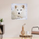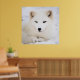 Photo of a cute white arctic fox resting in the snow. The animal has white fur and brown eyes and is looking at you. A real diva!