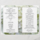 White beach wedding program to fold in half. Black text is easy to customize on both sides, equalling four pages in the program. White panels over a white floral background give the design a two-dimensional appearance. On the front a large white starfish / sea star is tucked among the flower petals. (The background images can also be removed for a plain, black and white program.) Include scripture (love is patient - or your choice) and a message from the couple on the "back". This template accommodates a longer ceremony needing lots of text, but can be used with less text as well. Fold after purchase.