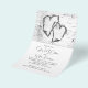 Budget wedding invitations with white birch bark design. Printed on very affordable flyer paper, the invitation comes in three sizes. Two hearts are “carved” into the wood at the top with text beneath. Names are in script and other text is printed, in black.