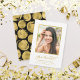 Announce your graduation with this classy photo graduation announcement featuring the word "Graduate" in a stylish script in faux gold foil against a white background with a faux gold foil border around the photograph. Card has a faux gold foil circles pattern against a black background back side.