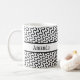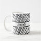 The surface of this mug is covered in a funky, retro white and black pattern with rows of diagonal waves. Through the centre is a black-bordered white band. A first name has been added over this band to both sides of the mug. You can add your name where the placeholders appear, write something else, or remove the words altogether. The font can also be changed to another if you like! It's great to play with this design and make it your own. Personalizing and editing is fun!