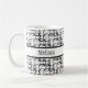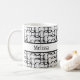The surface of this mug is covered in a funky, retro white and black pattern with rows of overlapping, open circles. Through the centre is a black-bordered white band. A first name has been added over this band to both sides of the mug. You can add your name where the placeholders appear, write something else, or remove the words altogether. The font can also be changed to another if you like! It's great to play with this design and make it your own. Personalizing and editing is fun!