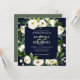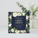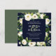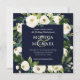 Your wedding details are encircled by a floral frame design of white flowers, roses and peonies in shades of ivory and white and green foliage on dark blue background.
