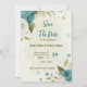 Beautiful romantic wedding save the date invitation featuring blue and ivory white flowers and some gold leaves .