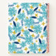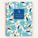 This monogrammed notebook features a floral pattern in blue, white, and yellow with hand-drawn tropical flowers. On a blue label, add your name and initial and the topic of the notebook.