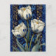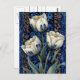 This striking vertical composition features three prominent white tulips with distinctive blue markings against an intensely rich blue background patterned with ornate gold damask. The image perfectly blends the botanical precision characteristic of Dutch Golden Age still life with the luxurious, intricate textile patterns popular in that era. The heavy use of vivid blue and gold creates a sense of regal opulence and deep contrast, highlighting the delicate, three-dimensional texture of the flower petals.