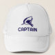 Custom name boat captain trucker hat with shark logo. Modern typography template for sailor, fisher or skipper. Make your own personalized cap for fishing, sailing or boating. Nautical navy blue and white colours. Cool masculine Birthday or Father's Day gift idea for men. Make your own for dad, uncle, father, brother, husband, grandpa etc. Custom headwear for summer. Ocean animal silhouette. Shark bite attack drawing.