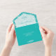 Elegant white botanicals and dots on turquoise (or any colour), these tri-fold wedding invitations feature your details in chic lettering in sections and a detachable RSVP card for guests to complete and return. **REMEMBER to put a stamp on the RSVP card section and include envelopes on your order to mail invites!