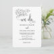A modern and elegant "we do" wedding invitation featuring an elegant swash calligraphy announcing, "we do," with a classic small serif font for details giving it a minimalist, formal, black and white invitation look with a modern upgrade. A lively hand drawn white bouquet hangs from the left corner above, "we-do."