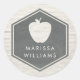 A sticker featuring an illustration of a hexagon with apple shape cutout. Personalize the name. Background is white brick. Look for matching items at The Pink Schoolhouse.